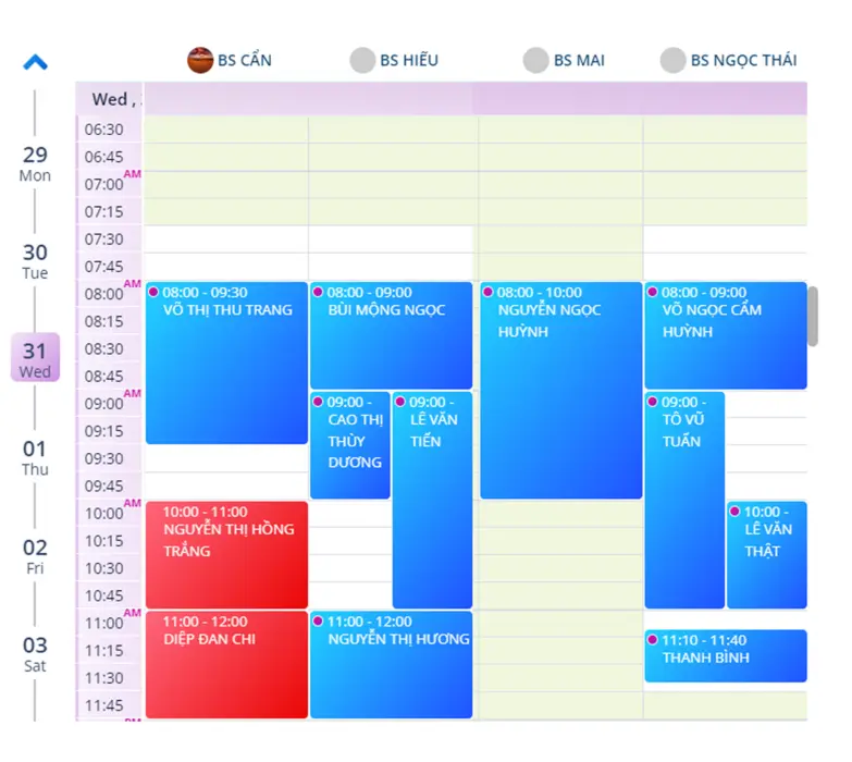 Trên phần mềm AI-CLINIC, lịch hẹn được sắp xếp theo lịch làm việc của Bác sĩ hoặc chuyên gia tư vấn trong khoảng thời gian 7 ngày, bạn có thể linh động thay đổi lịch bằng thao tác kéo thả đơn giản giúp việc lên lịch hẹn trực quan, điều phối lịch chủ động.