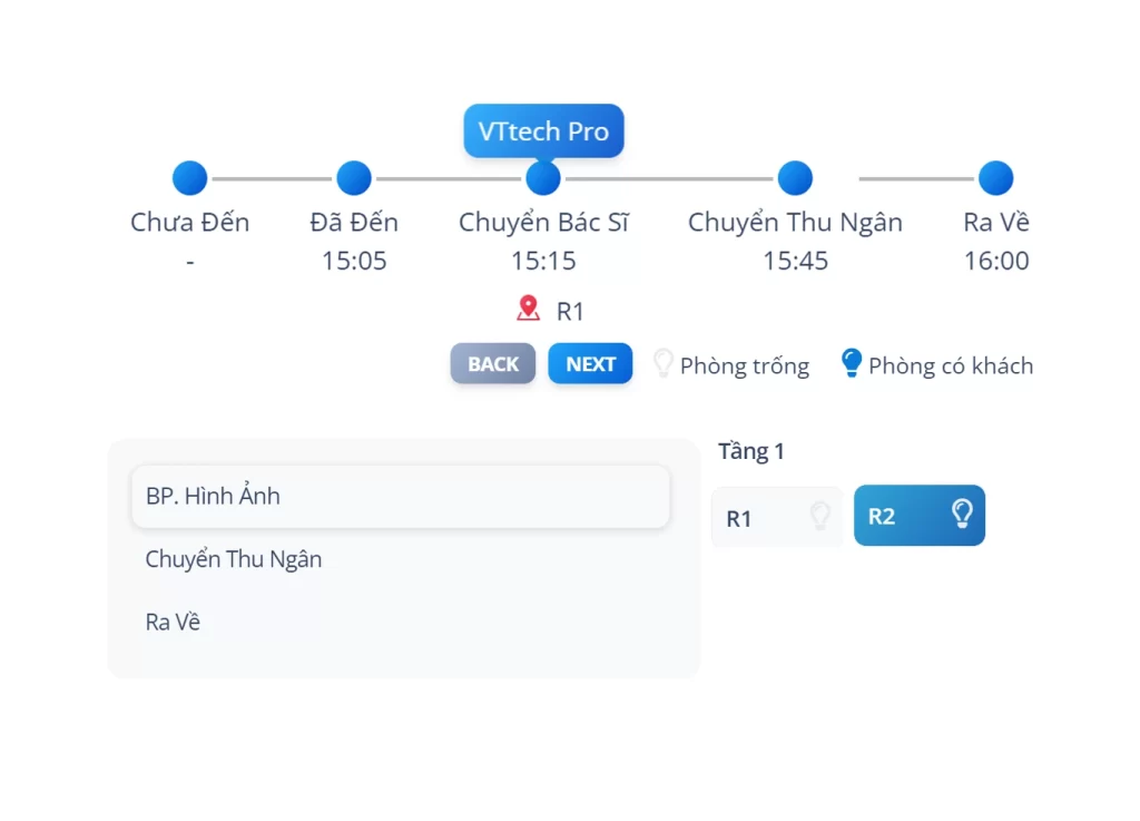 Chuyển đổi trạng thái lịch hẹn được cập nhật theo thời gian thực cho các bộ phận từ lễ tân, thu ngân, bác sĩ, bộ phận hình ảnh. Mỗi bộ phận nhận – chuyển dựa trên màn hình (Desk) riêng của mình.