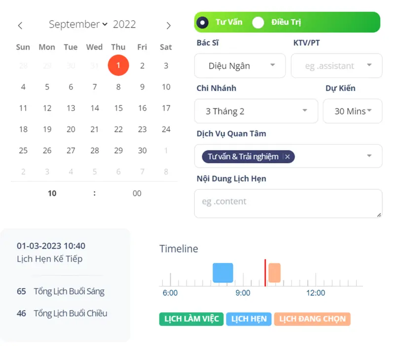 Phân loại lịch tư vấn hay lịch điều trị, ngoài ra còn liệt kê thêm loại chi tiết của lịch (trong trường hợp đặt lịch nhưng chưa chắc chắn hãy chọn loại lịch tạm).