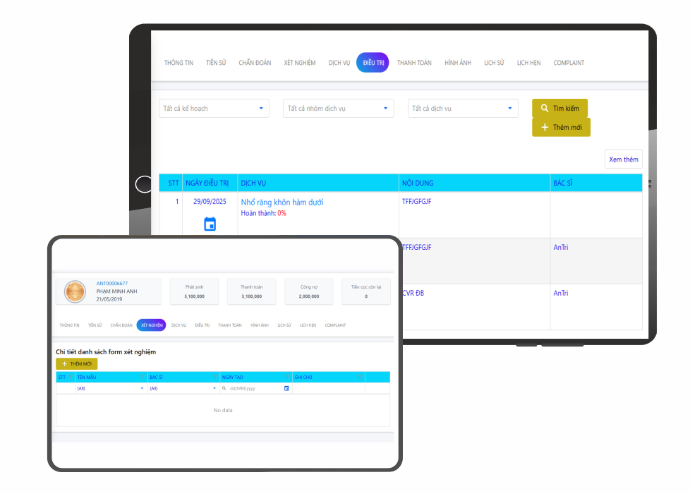 Hệ thống bao gồm chức năng lưu trữ dữ liệu tiền sử và xét nghiệm của bệnh nhân qua các lần điều trị.