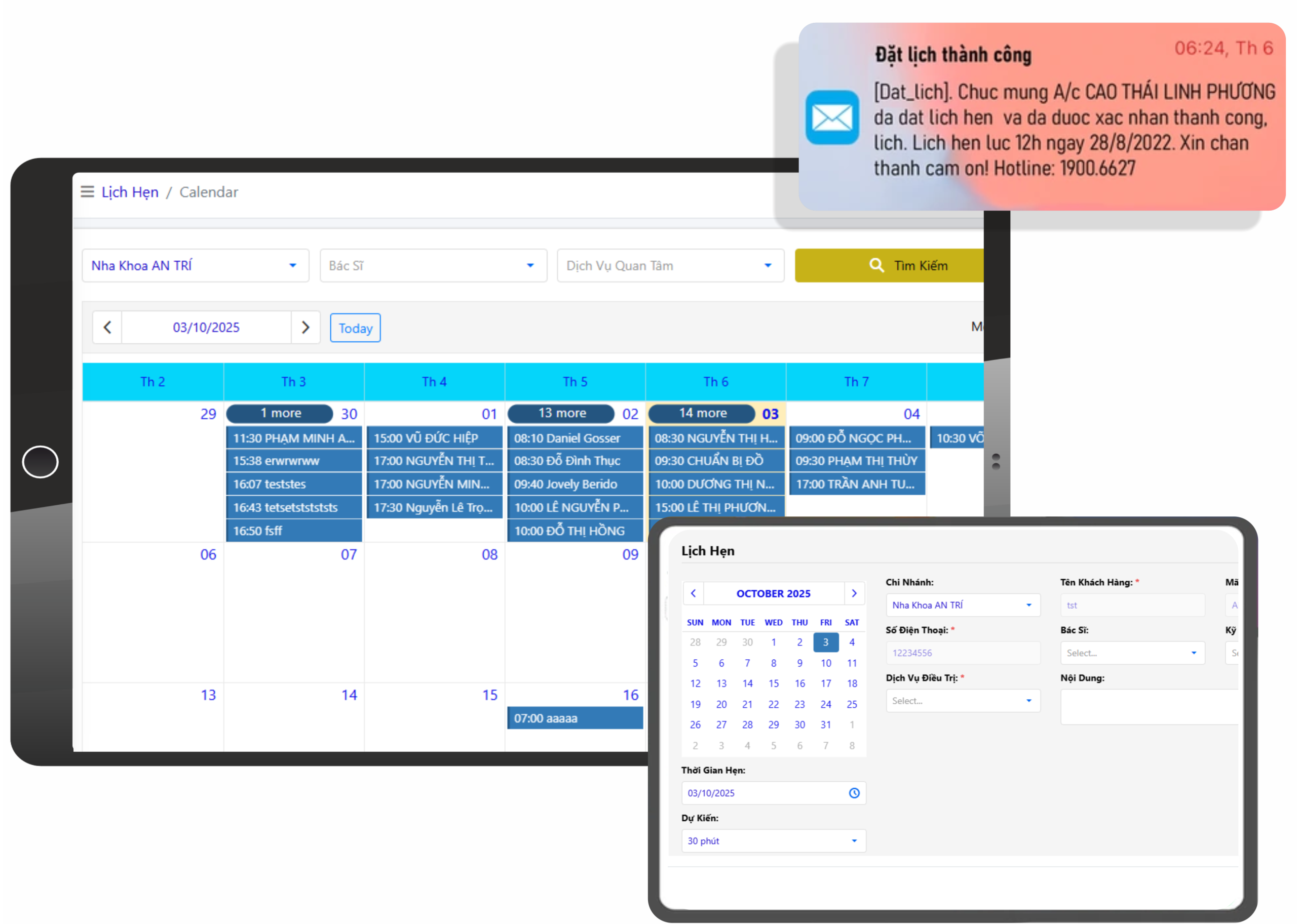 AI-CLINIC giúp bạn sắp xếp lịch hẹn khách hàng theo lịch làm việc của bác sĩ hoặc tư vấn viên trong khoảng thời gian 7 ngày, giúp việc đặt lịch hẹn được trực quan và thuận tiện hơn.